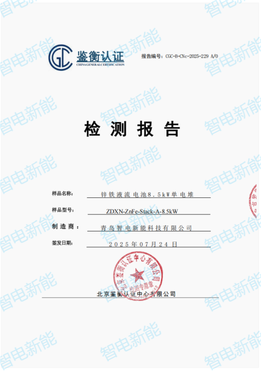 据全球液流电池网获悉,近日,青岛智电新能科技有限公司自主研发的新一代锌铁液流电池电堆正式发布,并成功通过北京鉴衡认证中心有限公司的权威检测鉴定,成为国内少数几家通过第三方机构检测的锌铁液流电池制造厂商之一。